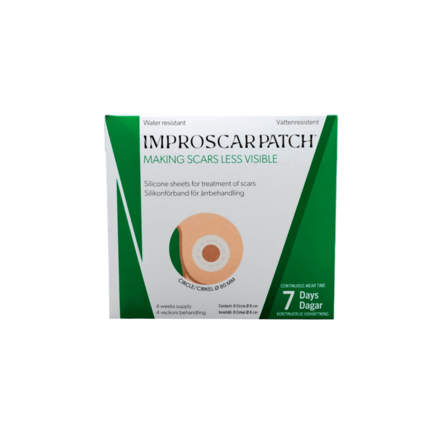 Improscar Patch Circle è una medicazione in silicone resistente all'acqua utilizzata per ridurre la visibilità delle cicatrici dopo un intervento di mastoplastica additiva e altri interventi chirurgici. Ogni cerotto Improscar copre la cicatrice per circa una settimana e può essere utilizzato anche sotto la doccia. Improscar Patch – Circle Ø80 mm contiene cerotti per il trattamento di cicatrici circolari, ad esempio dopo un intervento di mastoplastica additiva o un intervento di riduzione delle dimensioni di areole di grandi dimensioni.