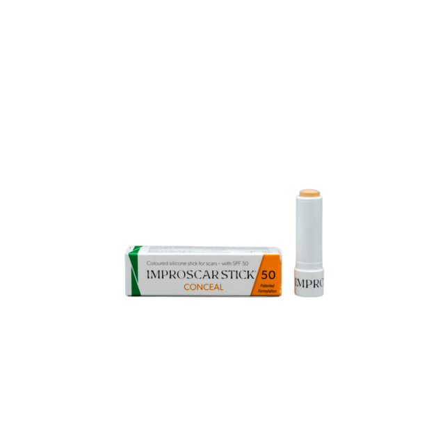 Improscar Stick® 50 Conceal è il primo trattamento al mondo per cicatrici sotto forma di stick in silicone resistente all'acqua con SPF 50, contenente pigmenti marroni per una riduzione immediata del rossore delle cicatrici, rendendole meno visibili.